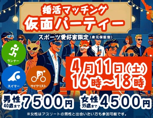婚活マッチングパーティ第1弾として スポーツ愛好家限定の身元保証型婚活マッチングパーティを 4月11日(土)に開催いたします。 狭い業界だからこその(仮面)(身元保証型)のパーティー...
